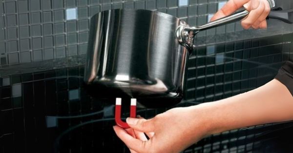 Dùng nam châm thử đáy nồi chảo, nếu nam châm hút chắc thì vật dụng đó phù hợp với bếp từ